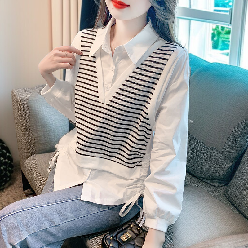 날씬해 보이는 스트라이프 셔츠 여 가을 휴가 투피스 긴팔 셔츠 예쁜 니트 쉬폰 상의 작은 셔츠 스트라이프 여 셔츠 상의